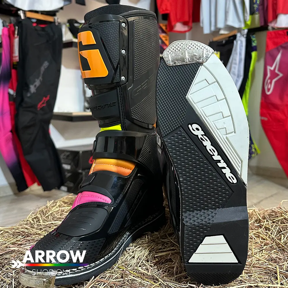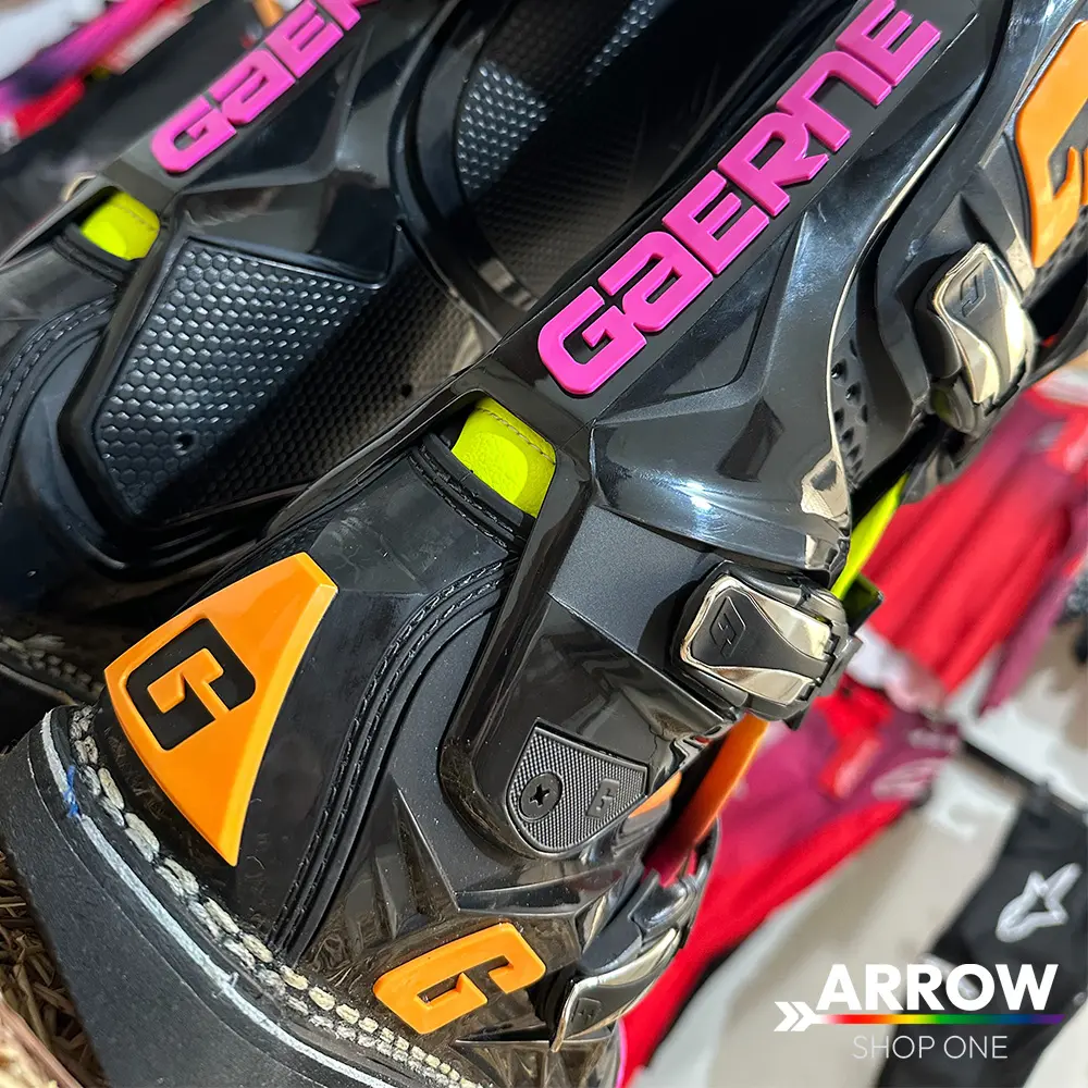 Las Gaerne SG12 negro/naranja/rosa destacan por su chasis de alta resistencia, el sistema de bisagra Dual Stage Pivot que mejora la movilidad y protege el tobillo, puntera reforzada, suela antideslizante de gran durabilidad, paneles internos de goma vulcanizada para mayor agarre, interior acolchado y transpirable, cierre mediante hebillas de aluminio regulables, protector de espinilla inyectado, control superior de torsión y un diseño llamativo que combina rendimiento profesional con comodidad y seguridad en motocross y enduro.