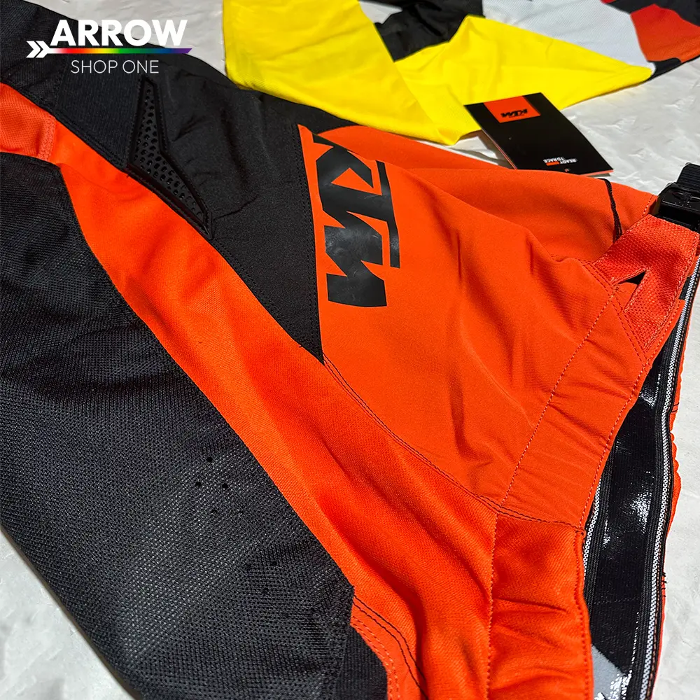 Traje KTM Pounce fabricado con materiales de alta resistencia que combinan poliéster duradero y paneles elásticos para mayor libertad de movimiento. Incorpora refuerzos en zonas de alto desgaste, costuras reforzadas y tejidos transpirables que mejoran la ventilación, ofreciendo protección, comodidad y rendimiento óptimo en condiciones exigentes de motocross y enduro.