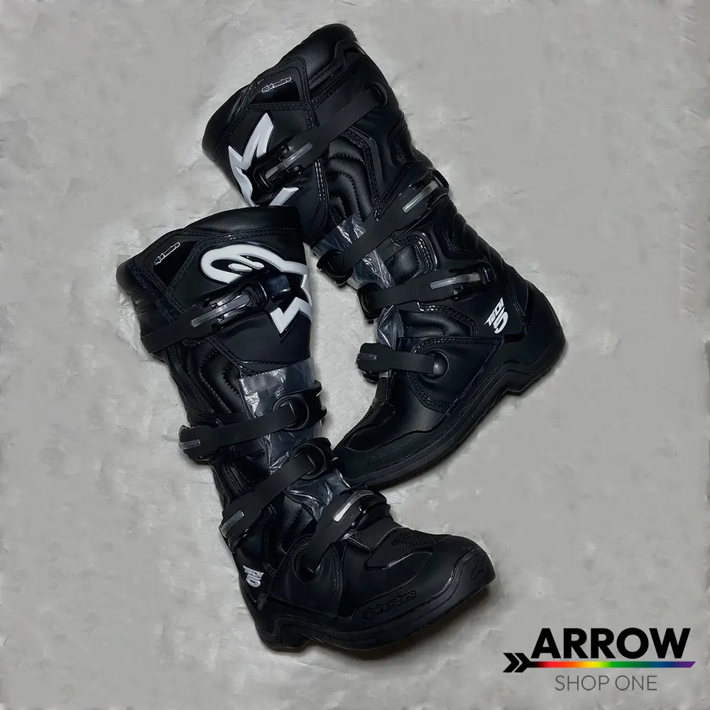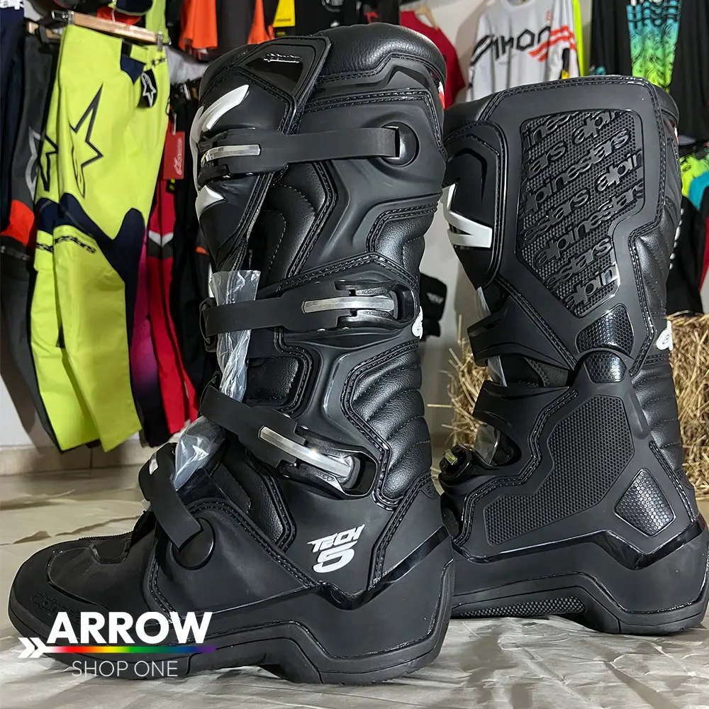 Las Alpinestars Tech 5 negras son botas de motocross que combinan alta protección, comodidad y durabilidad. Están fabricadas en microfibra resistente, con paneles de TPU en zonas clave y un sistema de articulación biomecánica que mejora el movimiento del tobillo. Incluyen forro interno acolchado, cuatro hebillas de aluminio con memoria de ajuste y correa de velcro para un cierre seguro. Su suela de goma de alto agarre, unida por inyección, ofrece excelente estabilidad y resistencia. En conjunto, son una opción confiable para pilotos que buscan seguridad, confort y rendimiento en todo tipo de terreno.